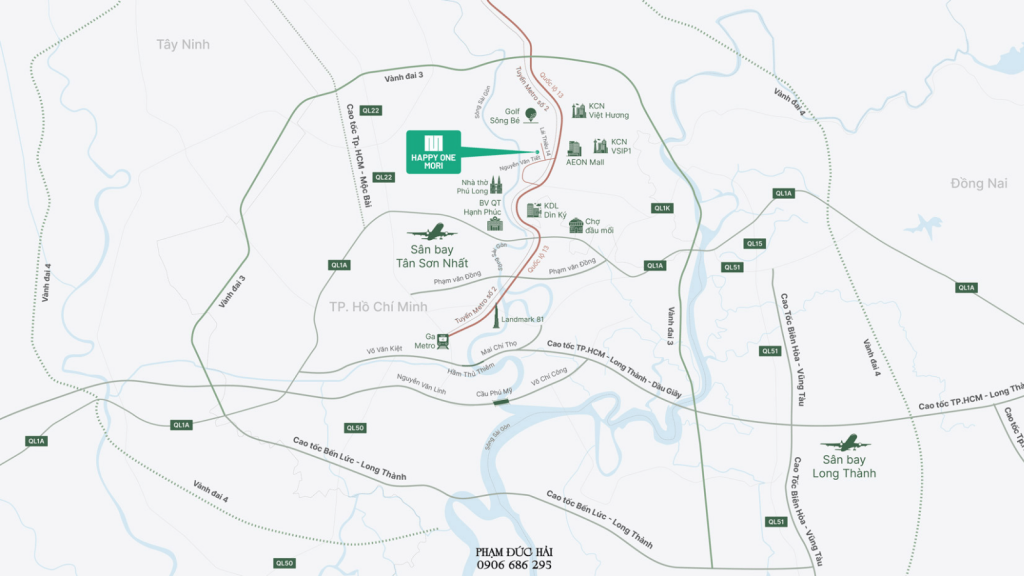 Tọa lạc tại mặt tiền đường Lái Thiêu 14 P. Lái Thiêu, Bình Dương, Happy One Mori kiêu hãnh vươn mình tại Đại Lộ Bình Dương – đại lộ lớn nhất của khu Bắc thành phố Hồ Chí Minh. Nằm ngay tại trung tâm Lái Thiêu, vị trí đắc địa này như một chiếc chìa khóa vàng mở ra mạch kết nối thịnh vượng cho cư dân Happy One Mori, khi từ đây cư dân có thể dễ dàng di chuyển đến Ga Metro số 2 ( Thủ dầu một – TPHCM ), Quốc lộ 13, Vành đai 3, Vành Đai 2, Cao tốc TPHCM – Chơn Thành… Điều này không chỉ giúp cư dân tiết kiệm tối đa thời gian cho việc đi lại, thuận tiện cho việc giao thương, học tập và làm việc mà còn đem tới tiềm năng phồn vinh nhờ dư địa tăng giá cao.